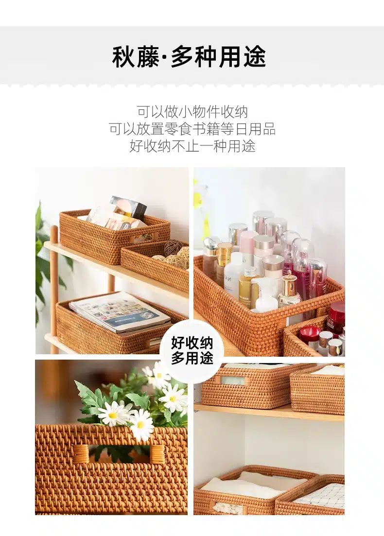 Panier de rangement Osellia en osier recomposé, de forme rectangulaire, conçu pour l’organisation et la décoration intérieure. Disponible en deux tailles, il mesure 29 × 11 × 9 cm en version S et 36 × 16 × 9,5 cm en version L. Le tressage manuel en osier recomposé offre une structure régulière avec une finition décorative festonnée. Utilisé pour le rangement de livres, accessoires, cosmétiques ou objets du quotidien, il s’adapte aux étagères, bureaux et meubles de rangement. Entretien simple par essuyage à sec ou chiffon légèrement humide.